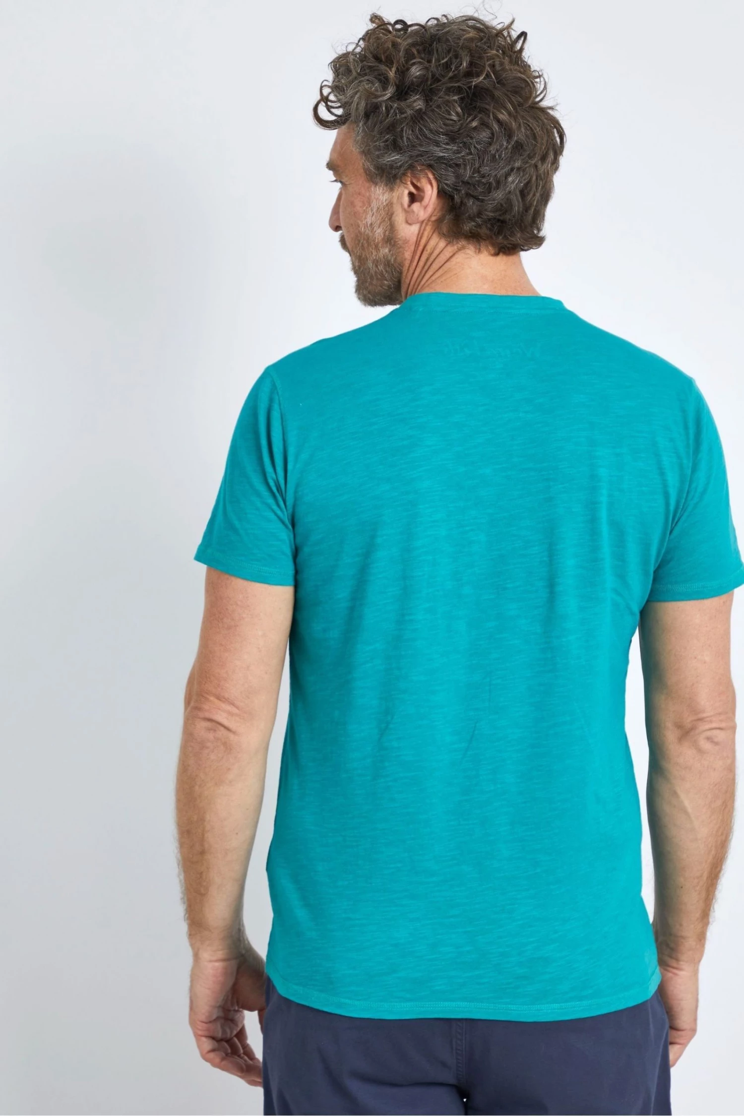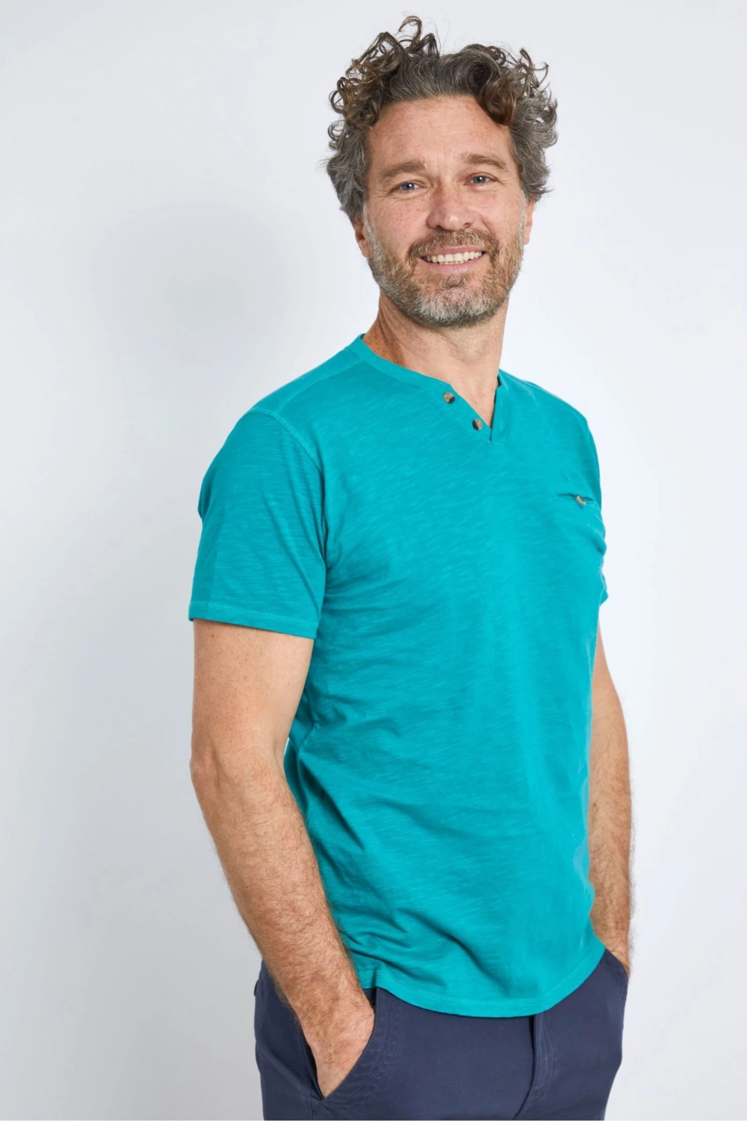 An easy-going, comfortable T-shirt for men, for those days where you don’t want a fuss. The Barrett henley tee has a creative flair with its button-up pocket and unique neckline. Wear the Barrett henley T-shirt with a pair of chinos for the perfect smart casual look! Features embroidered logo, chest pocket and two button neck line. Did you know that buying a certified organic cotton T-shirt saves a HUGE 2,457 litres of water over your regular, not so good for the planet, cotton tee? That is enough for one person to drink their recommended eight glasses of water a day for three and a half years.