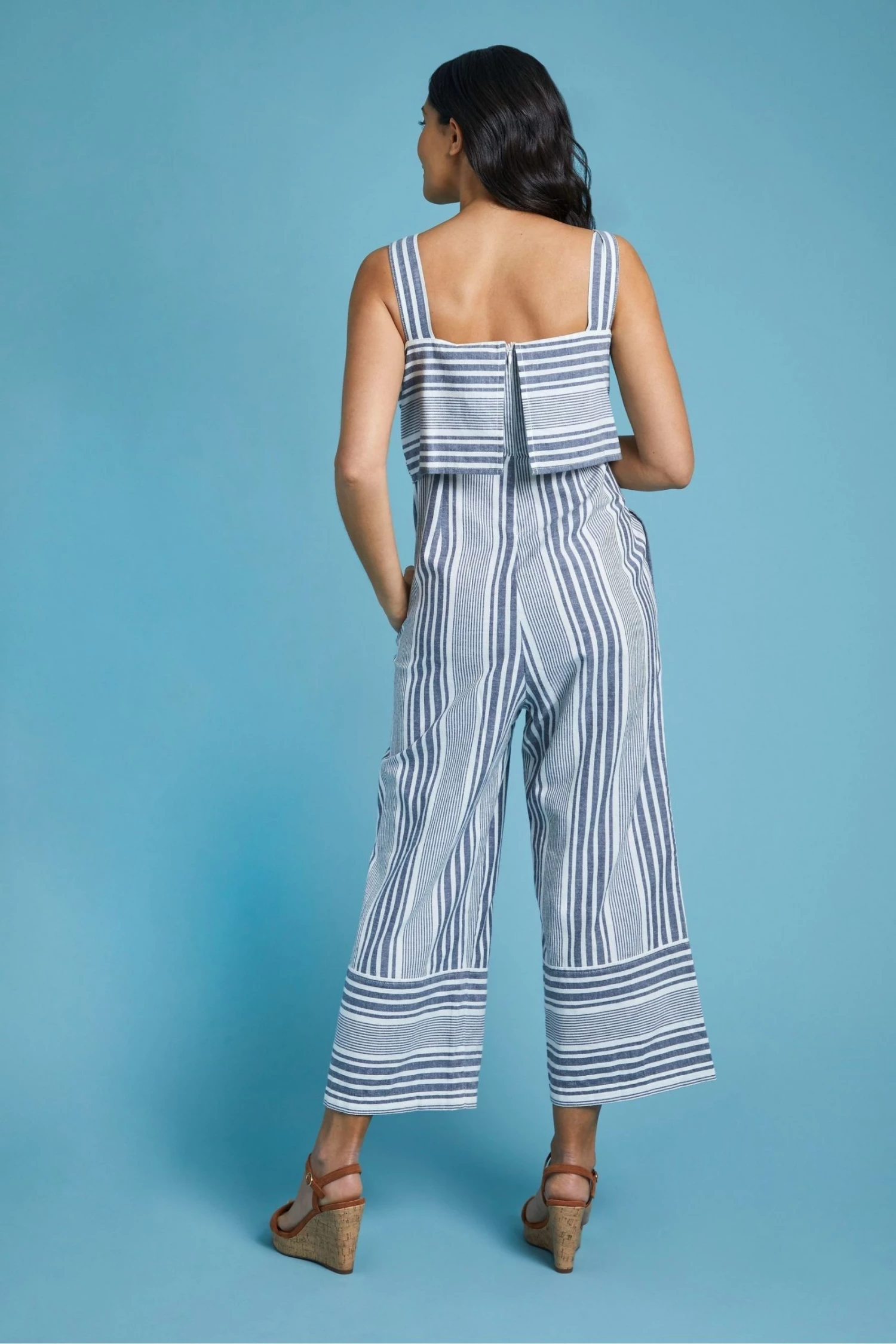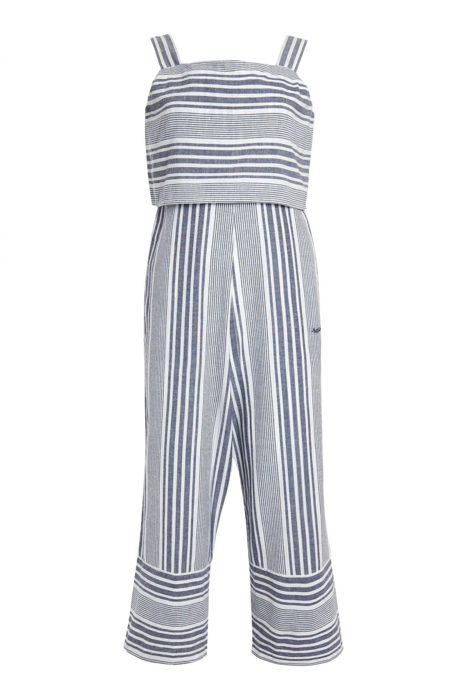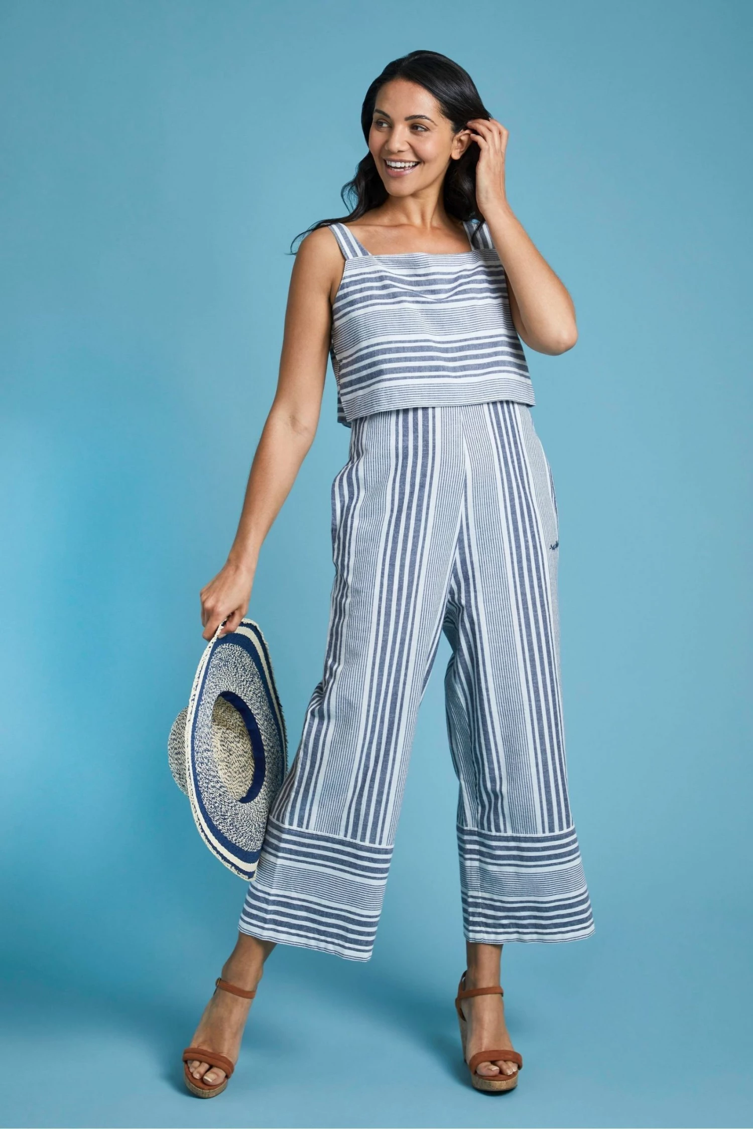 A classic striped jumpsuit made from a blend of cotton and flax. The striped Otavia jumpsuit provides a nautical feel when paired with canvas shoes or sandals. Dress up this nautical jumpsuit by pairing it with a pair of heels and a blazer. Casual by day, Hollywood star by night! Features – Sleeveless design. Embroidered Weird Fish logo detail. Concealed zip fastening. Two hand pockets. The choice to pick an organic cotton item of clothing is an easy one when you know there are no toxic chemicals used to grow the cotton. It doesn’t damage the soil and uses 88% less water than regular cotton and 62% less energy, so you can look and feel great knowing you’re doing good for the planet