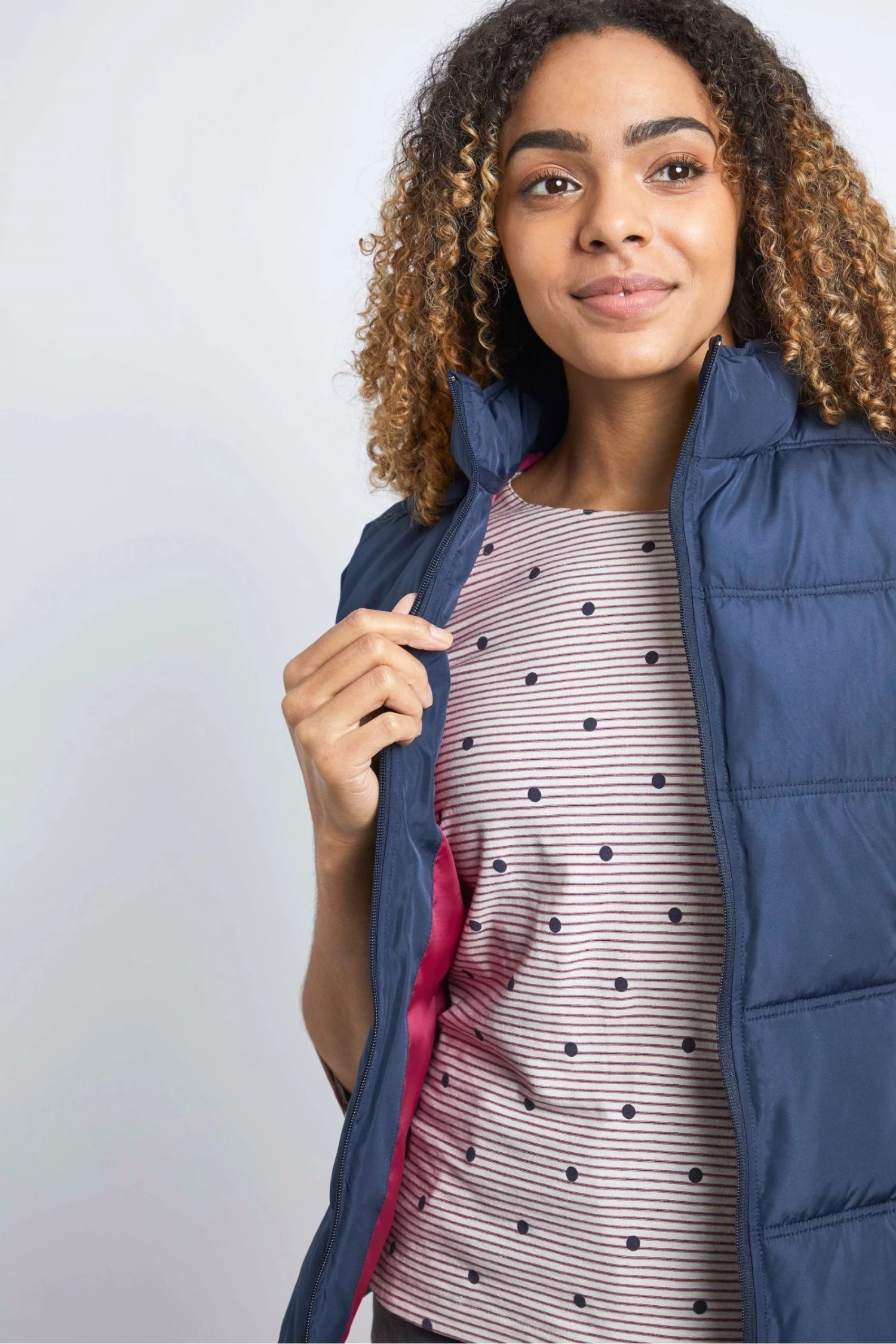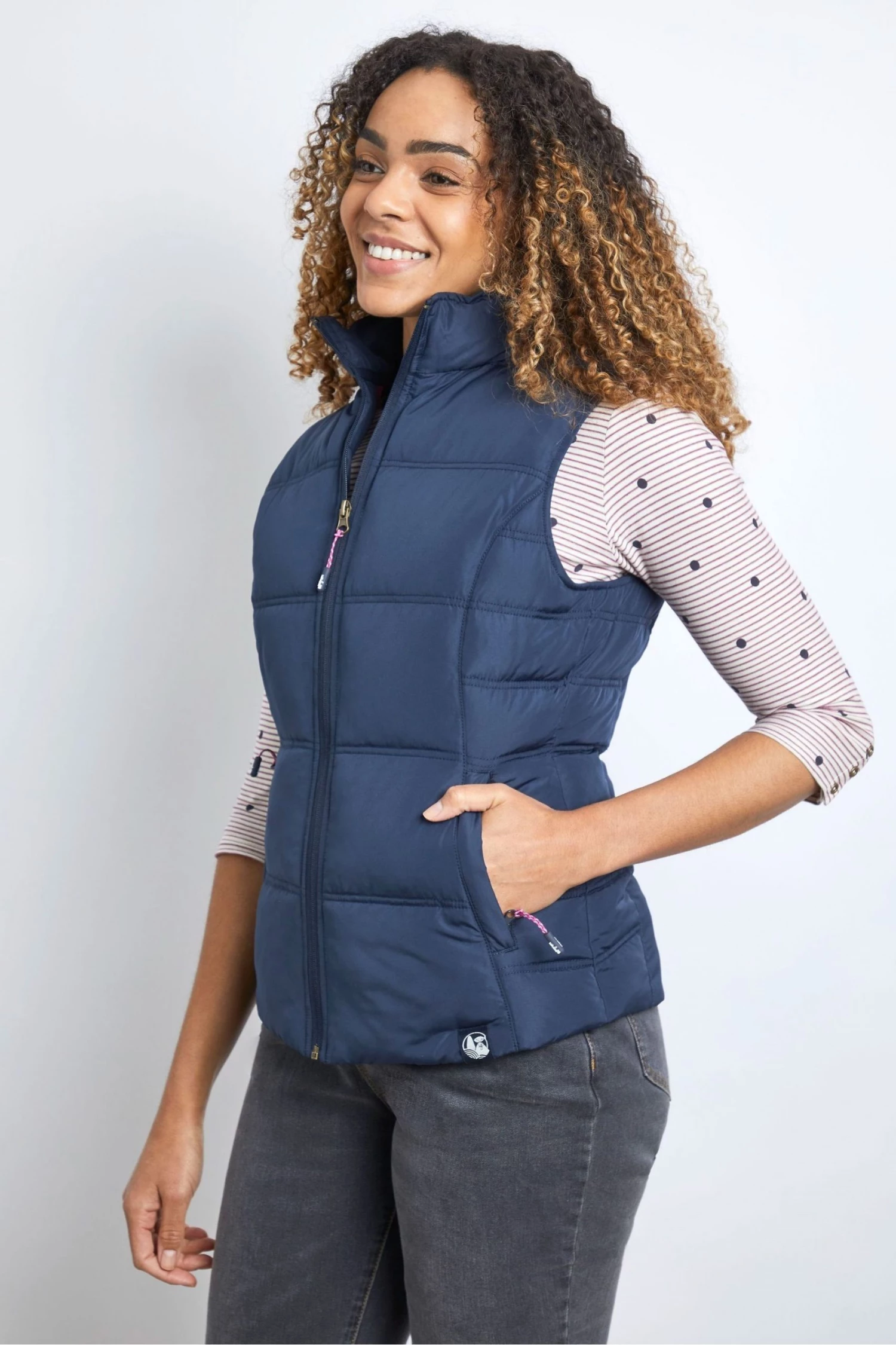 A lightweight gilet is great to see you though the changing seasons. Weird Fish’s versatile Rena gilet is perfect to pear with all your favourite outfits. Rock over their starshine dress for a feminine look or pop over your favourite tee and wear with denim jeans for a casual and practical look. Two hand slip pockets. High neckline. Bungee cord zip detail. Sleeveless gilet. Full zip. They love clothes and fabrics that do good, recycled polyester is making waves as it is turning pre-existing plastics such as that water bottle you used at a festival a life time ago into your new Weird Fish favourite. Using more recycled polyester rather than traditional polyester, reduces landfill, which means less soil contamination, air and water pollution.