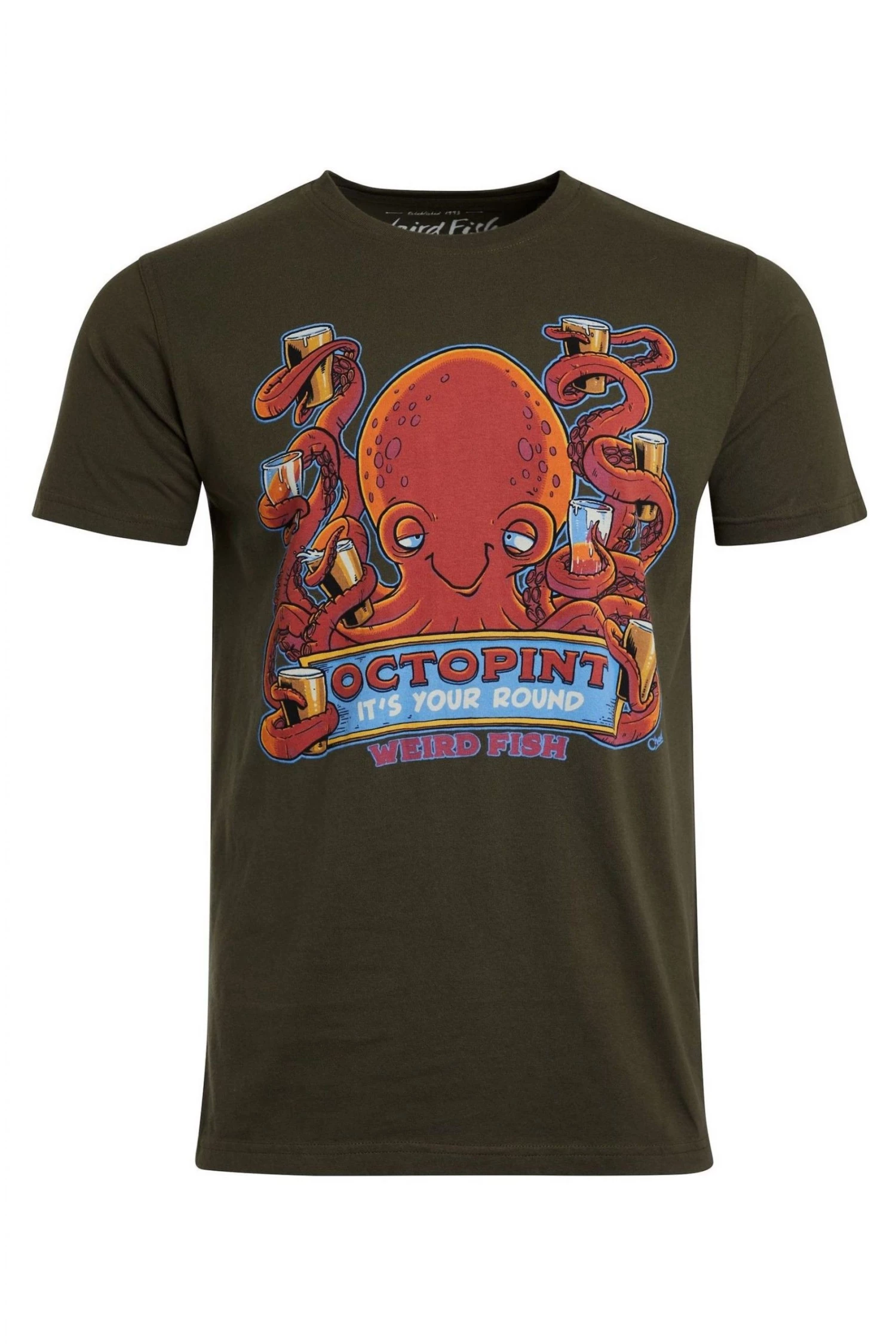 Having eight arms has its perks, one for each pint! Weird Fish’s Octopint artist T-shirt is made from organic cotton, features a crew-cut neckline, relaxed fit and fun Weird Fish design. Wear with your favourite pair of denim jeans for a cool and casual look. Relaxed fit. Made from organic cotton. Exclusive Weird Fish design. Crew neck top. The Weird Fish Artist T-Shirts are synonymous with the brand, they have been with Weird Fish since 1993 and they are how they got their name. Always made from quality cotton, they have now upped the sustainability by making many of their Artist T-Shirts from organic cotton, which uses less water and less energy to process. With a mix of front and back prints across the range, and every design featuring that famous Weird Fish tongue in cheek whit.